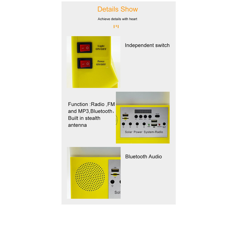 プロダクトはランプに充満ラジオのための太陽読書ランプ、太陽街灯、庭ランプ、家の照明装置および携帯電話、供給力のための高容量の太陽系、供給力のためのテレビおよびファンおよび屋内AC電気器具に太陽電池の貯蔵システム含んでいる。